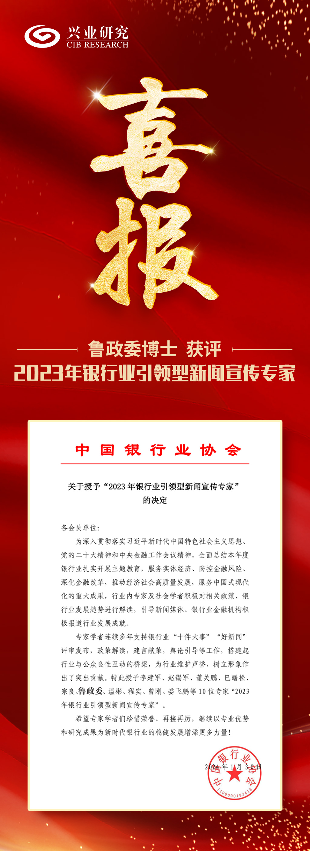 近日,中国银行业协会开展年度“银行业好新闻”评审发布工作。兴业银行首席经济学家、兴业研究公司学术评审委员会主席鲁政委博士被评选为“2023年银行业引领型新闻宣传专家”。